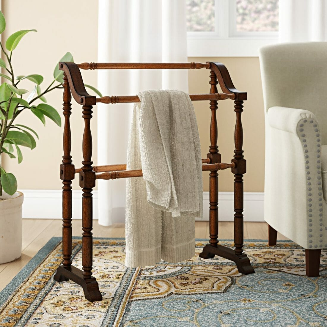 This wooden quilt stand suits any traditional living room for sure. Not only does it come with stunning details but also emanates warmth.