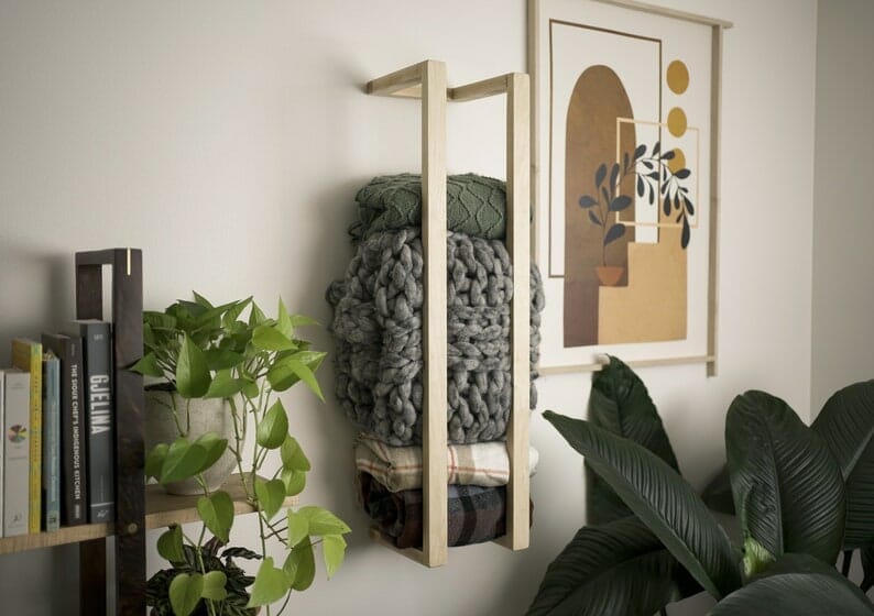 Here, the trendy wall rack holds folded blankets of different kinds. Furthermore, it mingles with the nearby artwork and open shelving excellently.