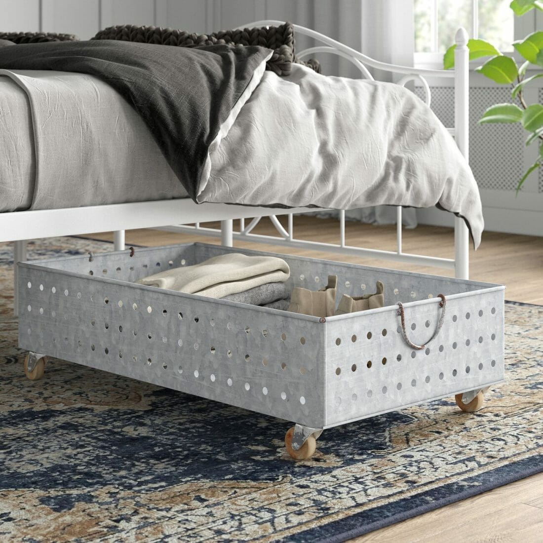 You can put this galvanized metal storage drawer under your bed to save some space. The rug prevents it from causing damage to the precious hardwood floor.