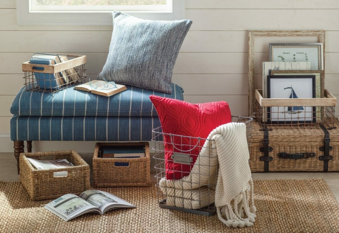 This massive wire basket lends the coastal living space a modern farmhouse feel. Furthermore, it fits in with the shiplap wall and upholstered bench. The unit lets you air the blankets out when not in use, too.