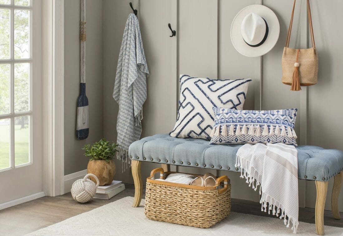 In this mudroom, the wicker blanket basket underneath the bench introduces a beachy ambiance. Meanwhile, metal hooks provide display space for the hat, bag, and blankets.