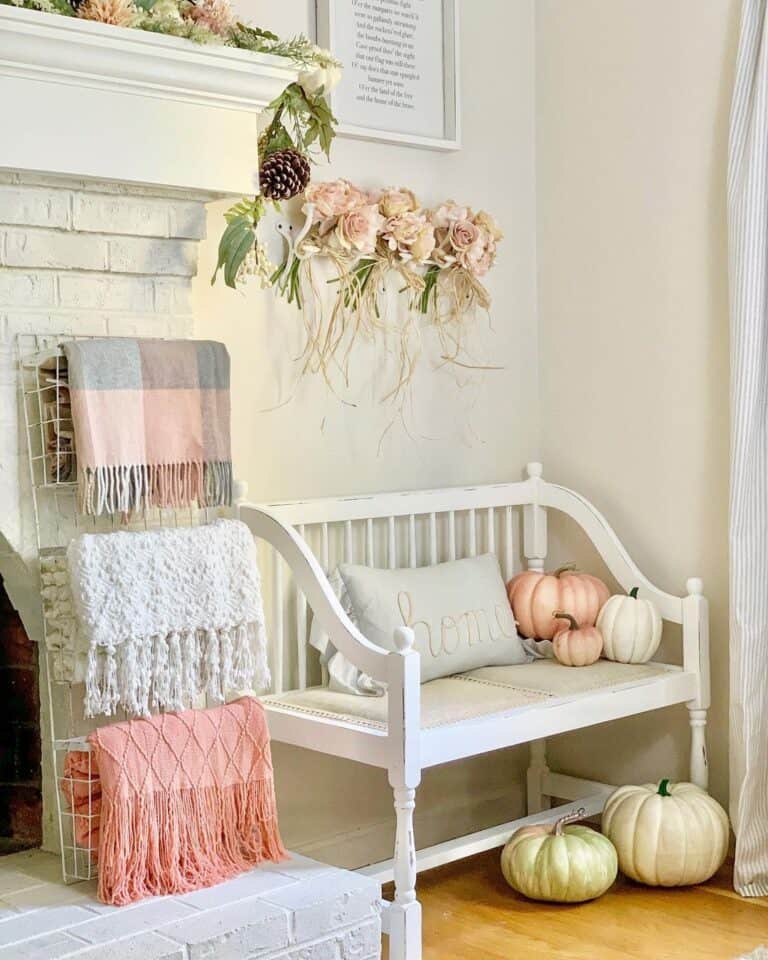 Without a doubt, this magazine rack makes for an excellent towel holder in any compact room. Meanwhile, the throw pillow and fake pumpkins on the adjacent bench ensure the interior seems welcoming.