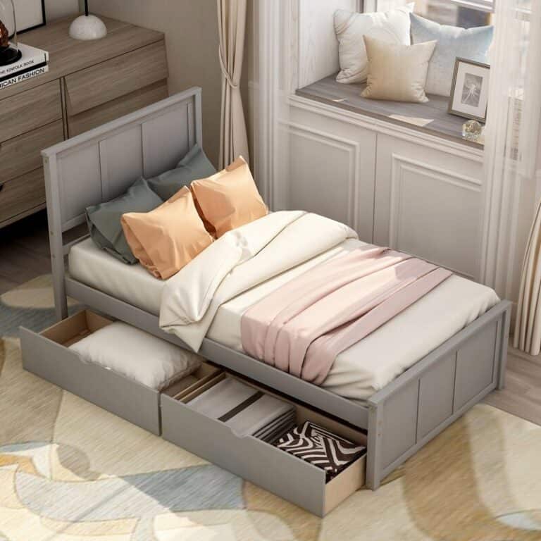 As you see, the modern gray bed has a secret. Moreover, it employs storage drawers underneath that accommodate the extra pillow and blankets.