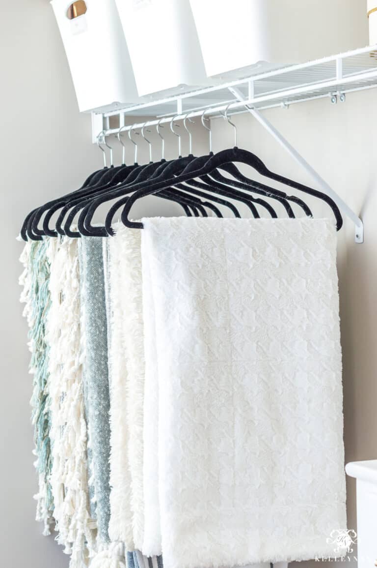 Here, the velvet hangers allow blankets to be on display and wrinkle-free. Thanks to them, you can access any blanket with ease.