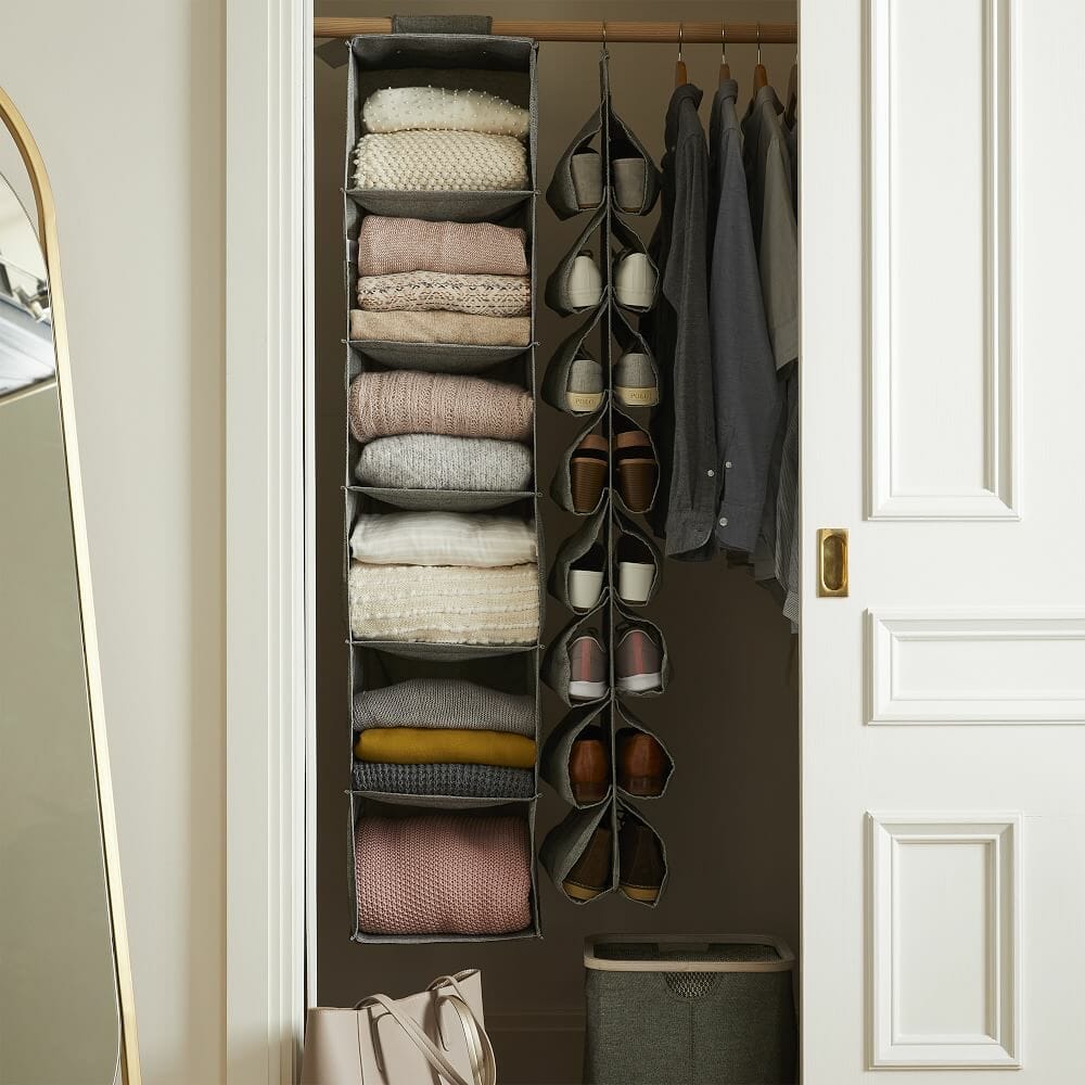 These fabric cubbies deliver a mid-century modern edge. Furthermore, they live fabulously with the matching shoe rack and metallic hangers.