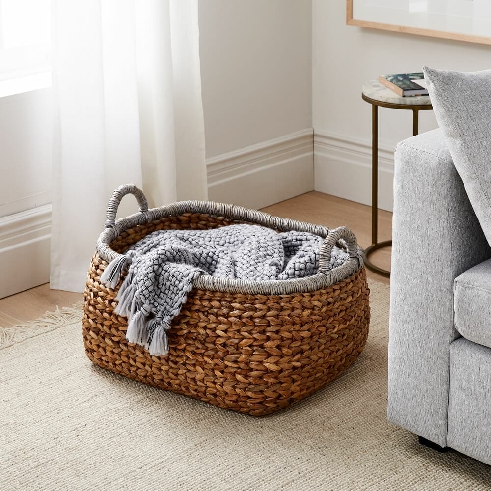 Blanket baskets don’t have to be boring. This dolphin water hyacinth basket evokes playful vibes while offering practical storage. Furthermore, it’s suited to coastal or boho living spaces.