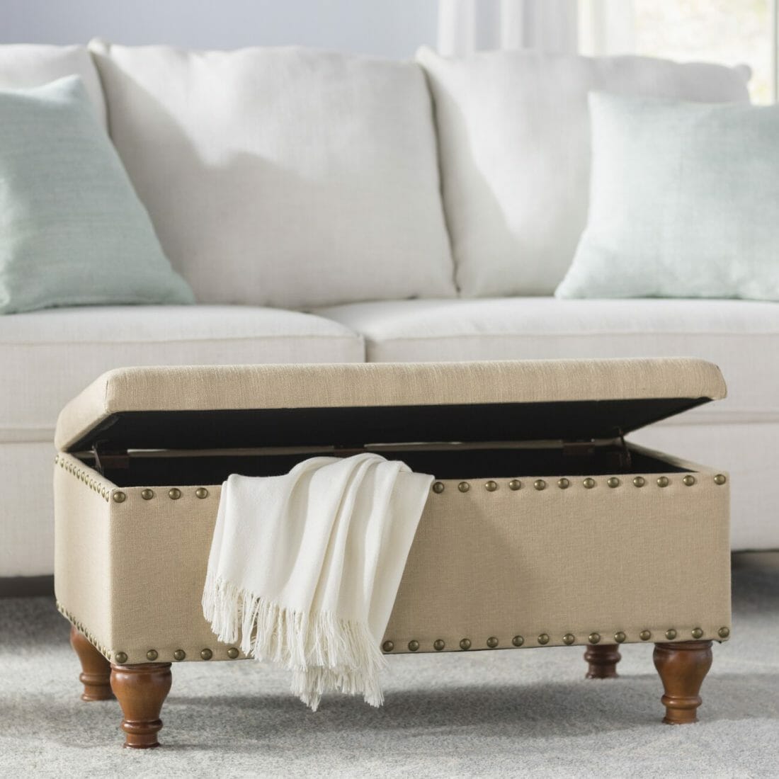 This beige storage ottoman soothes the soul. In addition, it hides extra throw blankets when not in use, so the interior stays organized.