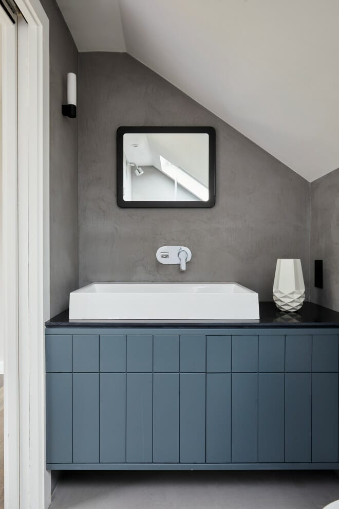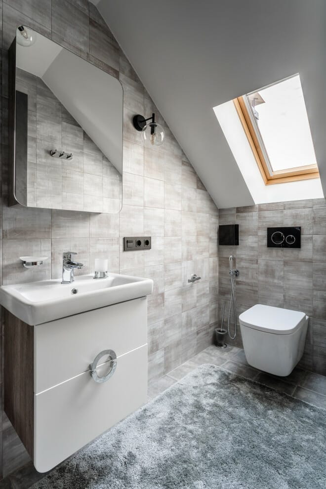 Even though this loft bathroom is pretty compact, the neat arrangement and color selection stamp the opposite imprint. By mounting everything on the wall, they leave spaces above the ground and let the room feel airier.