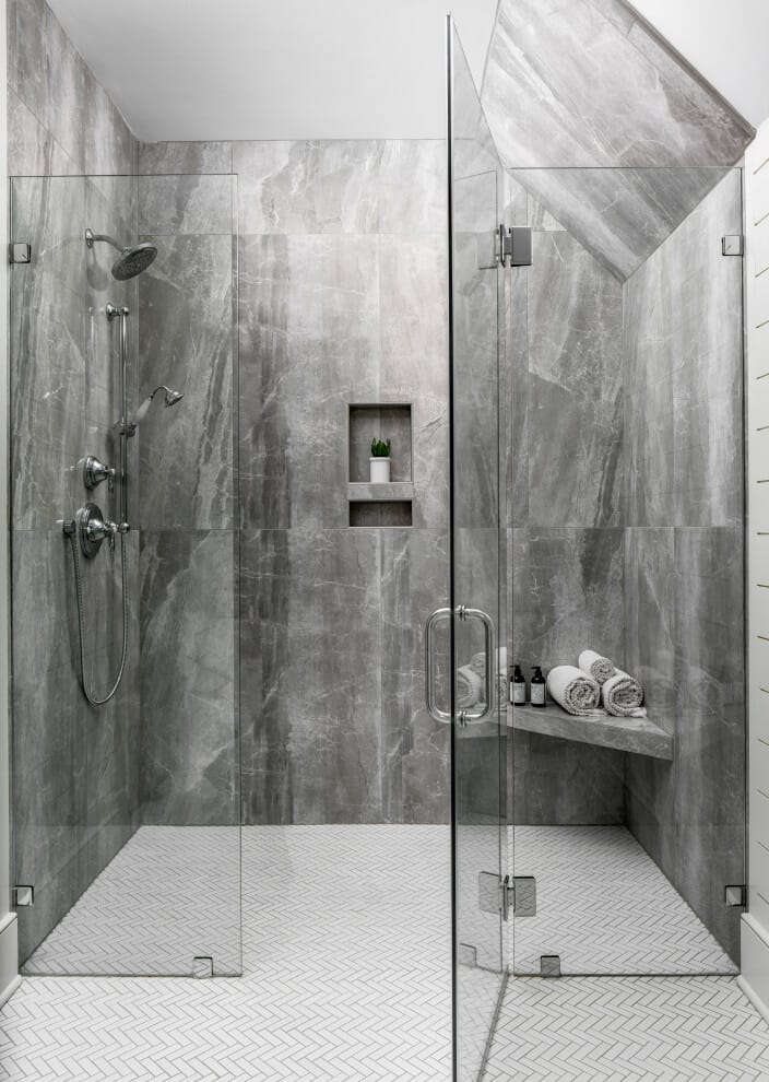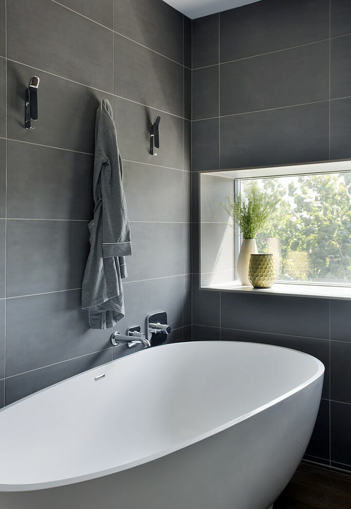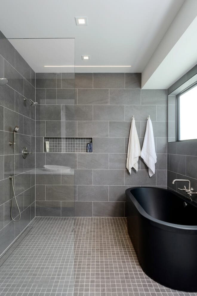 Moreover, the wall niche backdrop also uses the same grid tiles as the floor. What makes this gray bathroom even chicer is the black freestanding tub across the shower. It makes a lot of statements.