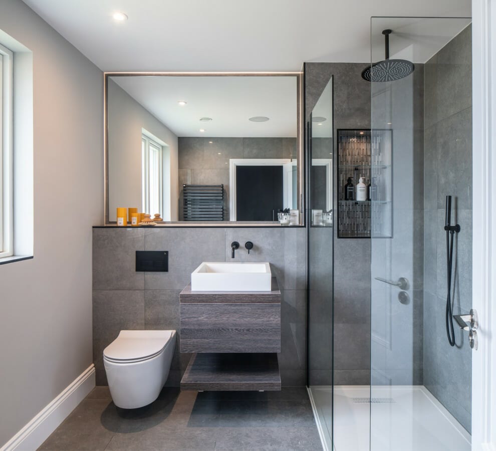 You have to admit that the permanent floating shelf should be on the list of small gray bathroom ideas for the practicality it offers.