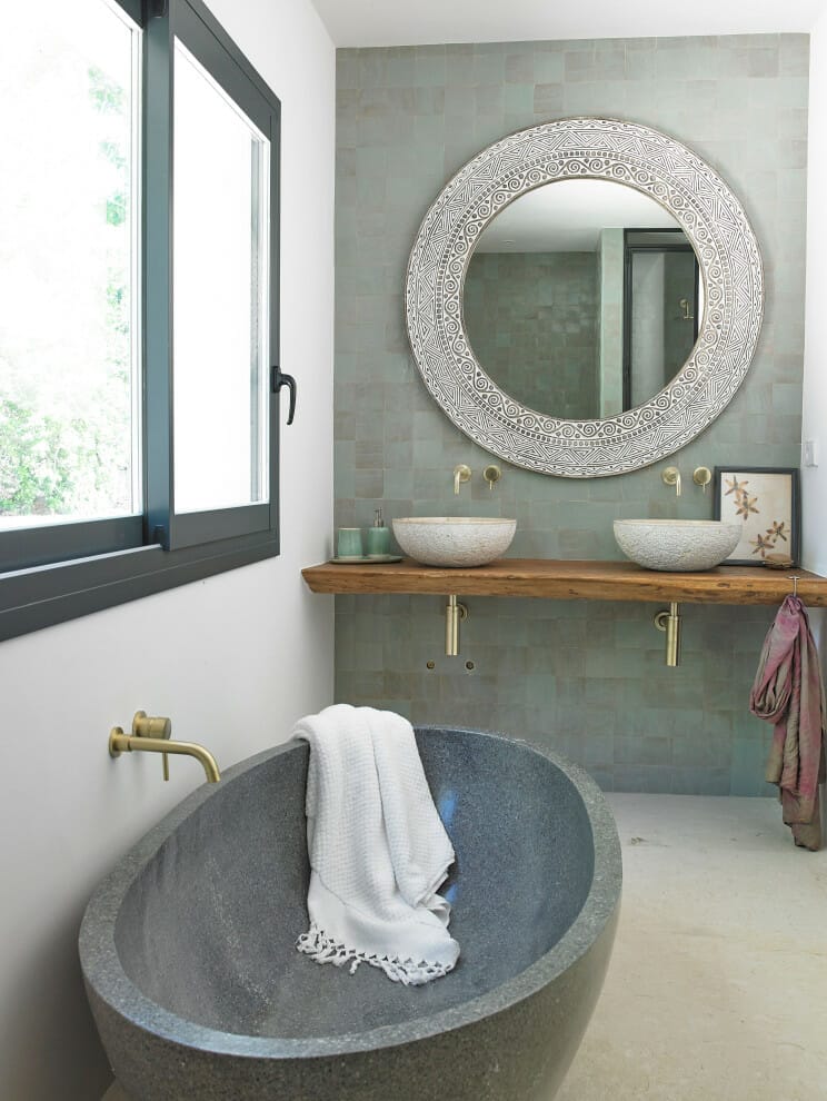 No wonder why this bathroom features a sphere stone bath plus a double vanity sink in a similar shape and material. Besides rustic, you could also feel a bit of Mediterranean style from the framed round mirror.