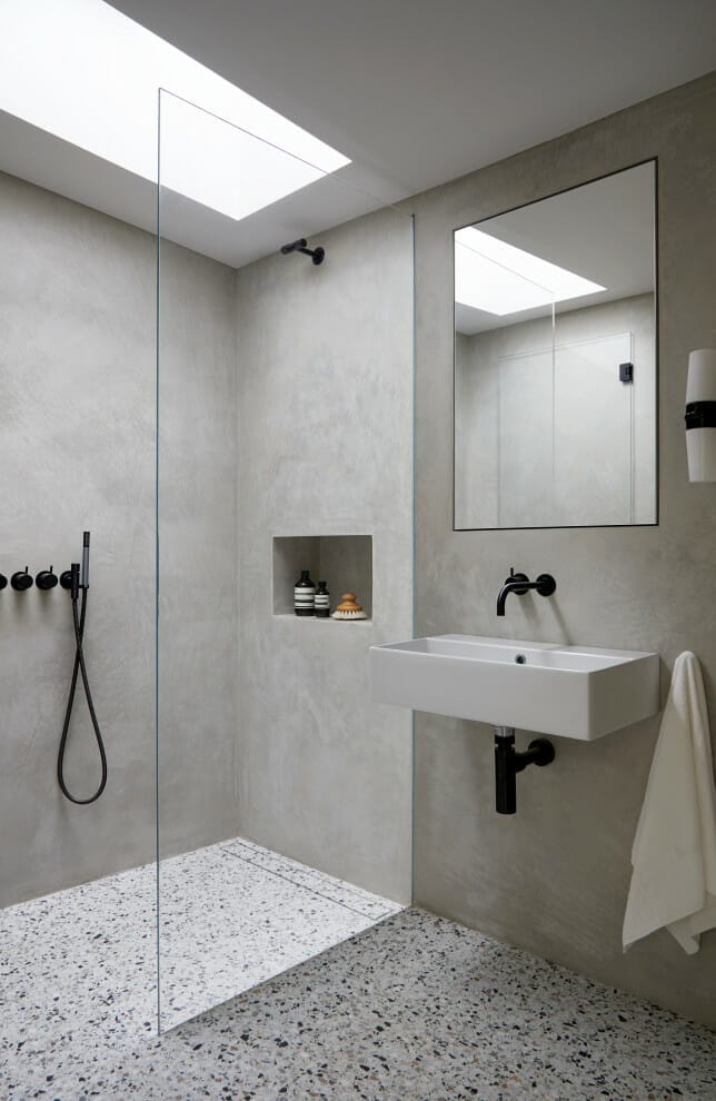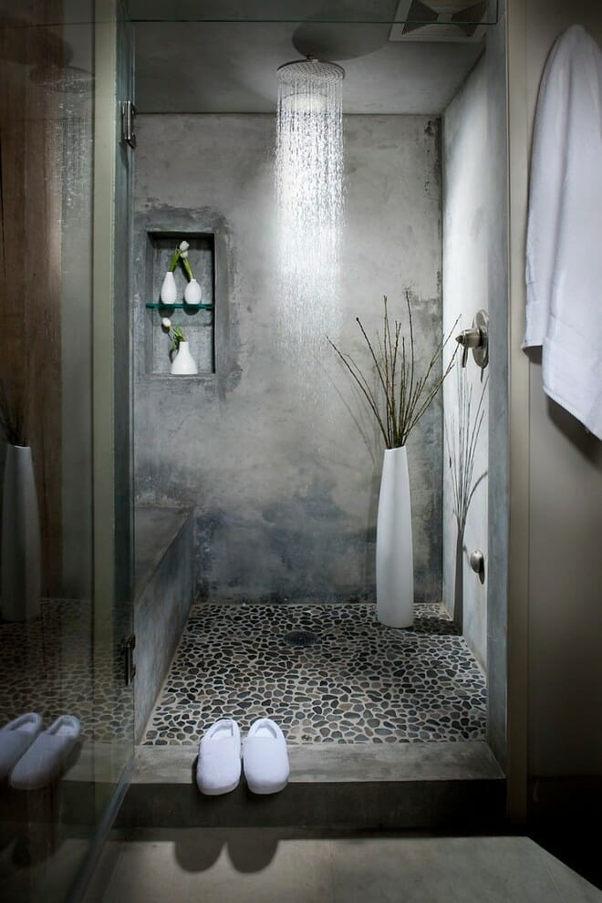 18. Small Gray Bathroom Ideas with Rough-Surfaced Tiles