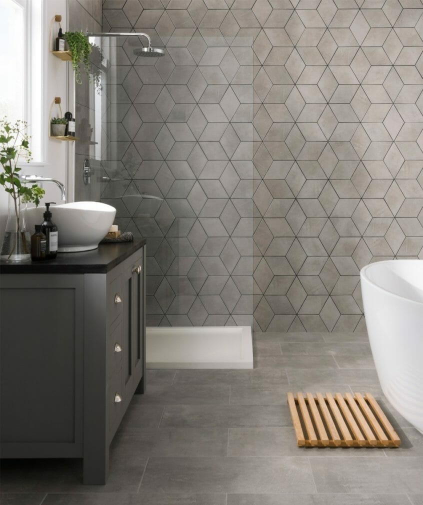 3. Small Gray Bathroom Ideas Using Trendy Ceramic Tile