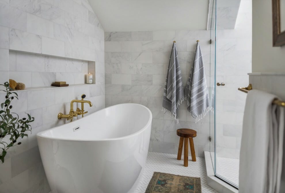 What defines this bathroom modern is the marble tiles walls, double-ended freestanding bathtub, herringbone tiles flooring, and the recessed wall storage.