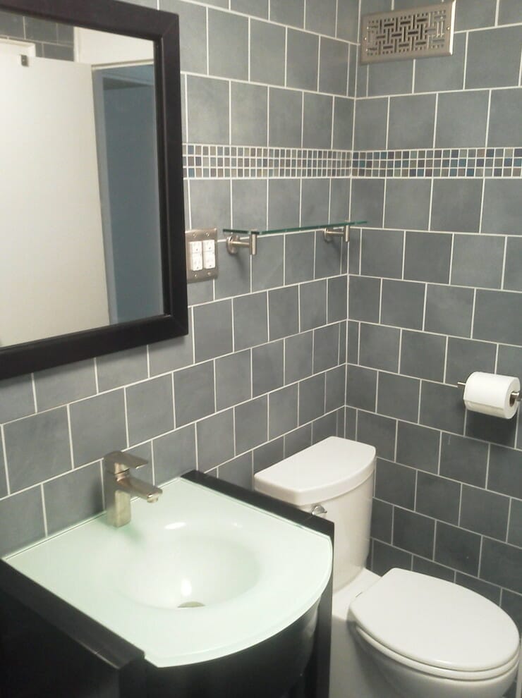 After remodeling, this bathroom now features geometric tiles floor similar to one of the small gray bathroom ideas you see earlier. But the difference is, this idea uses square tiles instead of a rhombus.