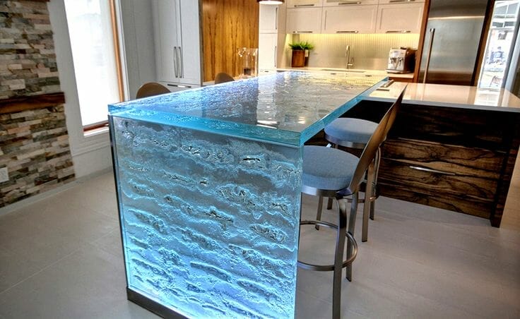Of the many unique kitchen island ideas, this design is the most thriving in attracting attention. An illuminated glass bar counter does not require a lot of ornamentation to make it stunning.