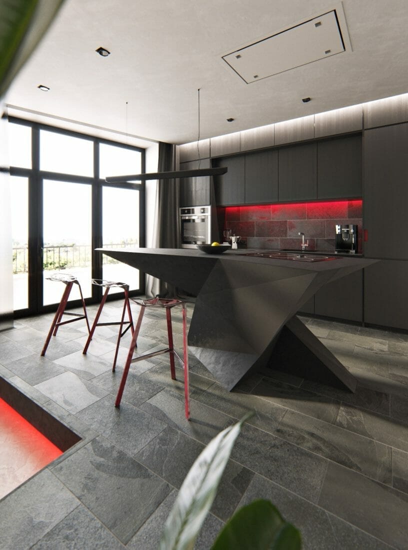 9. Modern Kitchen Island Ideas in Origami Style and Red Lights