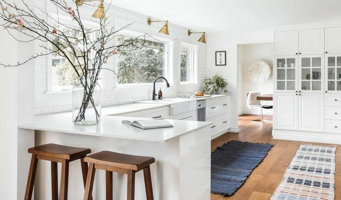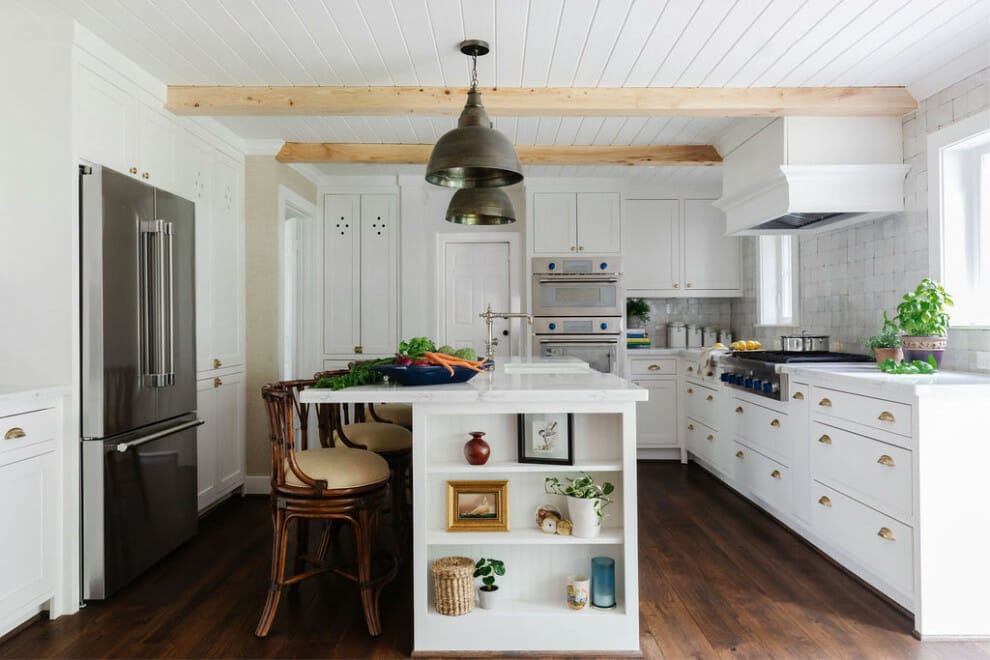 The white L-shaped kitchen island may be typical for homeowners. But, you can embellish it to be more exciting.