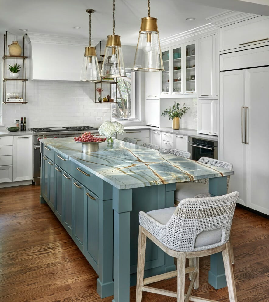 As in the picture above, you can find a marble kitchen island with an extended top to form a bar. Visually, this already looks luxurious but still needs an artistic touch to make it more stunning.