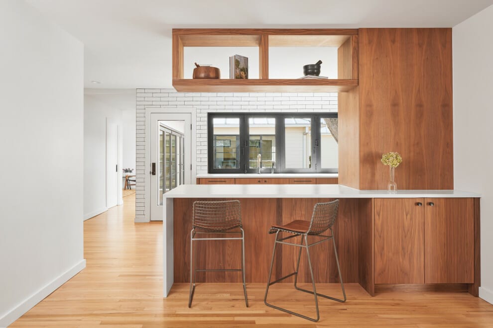 However, instead of giving the same material to the bar, providing it with a wooden top is better. This transition will inherently make your kitchen island look more characterful than before.