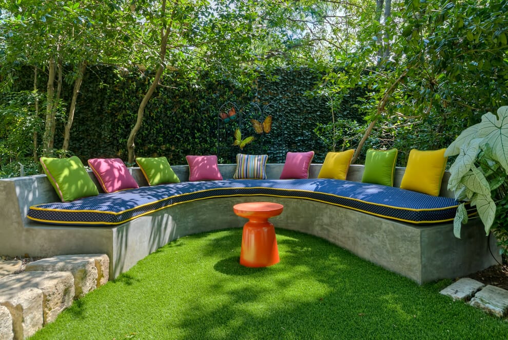Next, set a built-in bench with a curved shape that follows the turf’s edge to complete the exterior decor. You can also arrange some colorful cushions to give a pop of color as a final touch.
