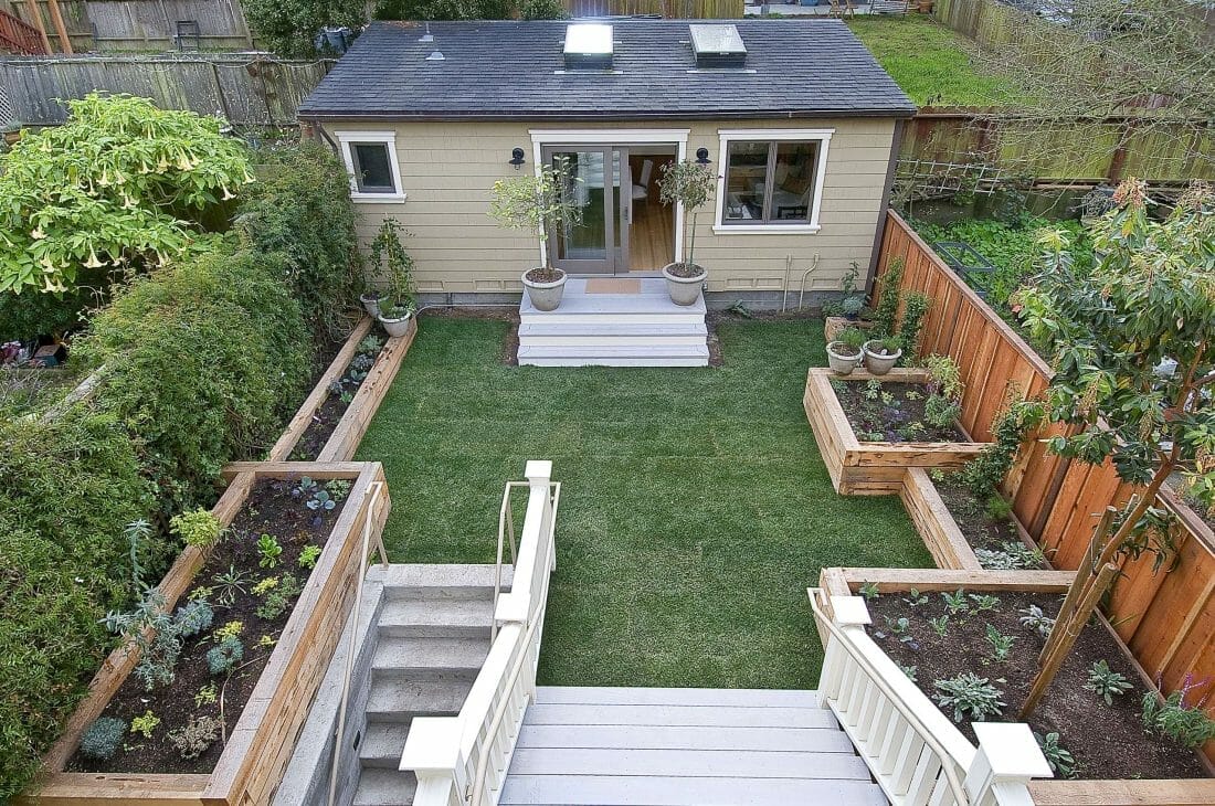 6. Small Backyard Turf Ideas with Raised Garden Beds