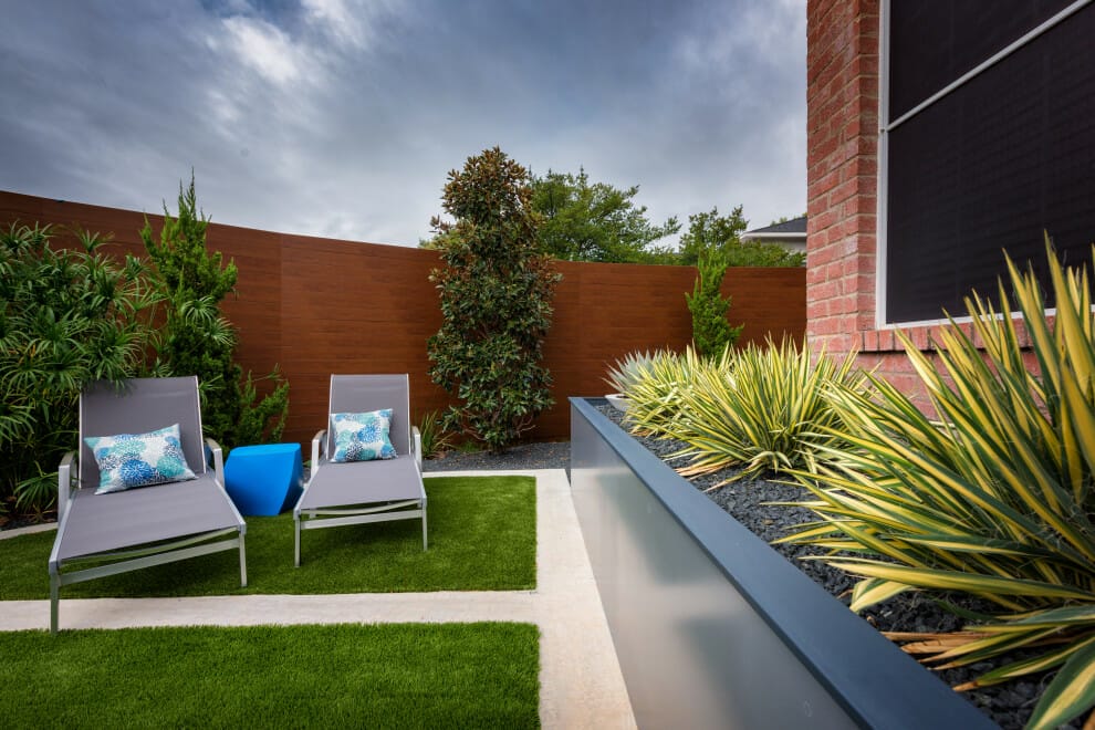 22. Small Backyard Ideas with Turf and Dark Gray Seats