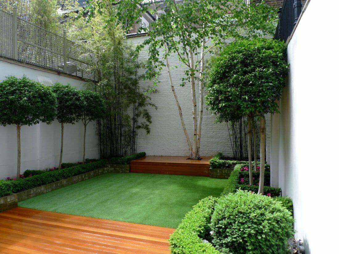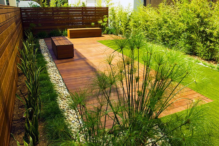 19. Small Backyard Turf Ideas with Polished Wood Decking