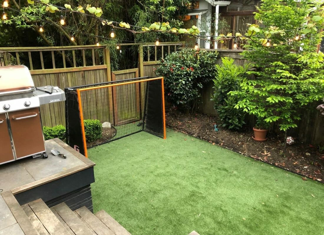 Transform your simple backyard turf into a football court. Besides, you can also build a raised patio as your BBQ area.