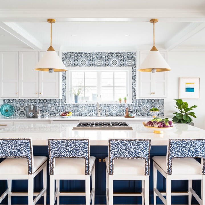 This coastal kitchen, for example, has a white and black wallpapered backsplash. It catches the eye without overwhelming the cooking area.