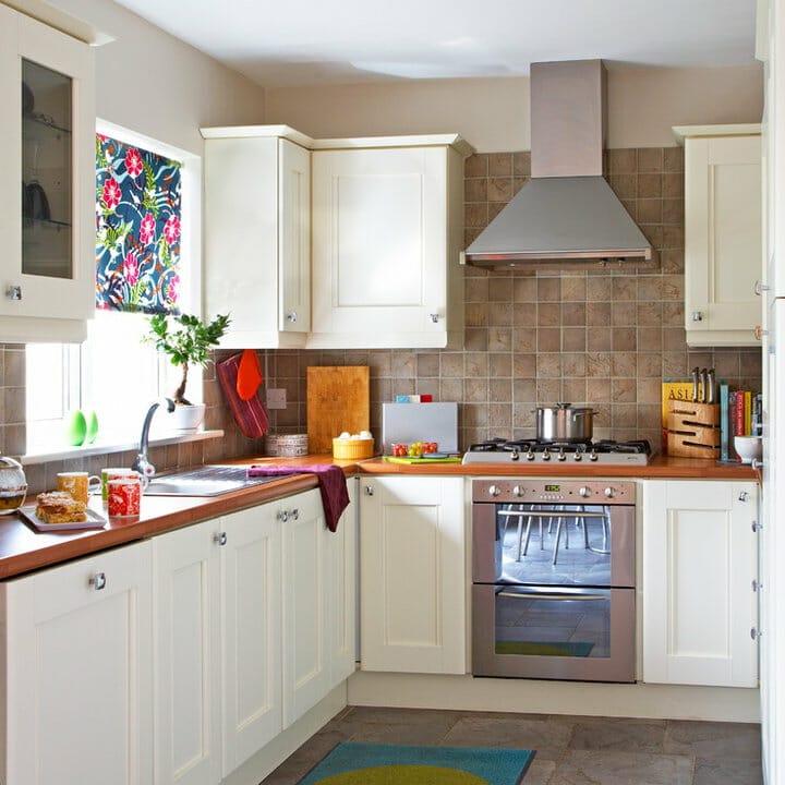 These Spanish tiles inject pops of color. In addition, they lend the compact kitchen a visual appeal while providing some personality.