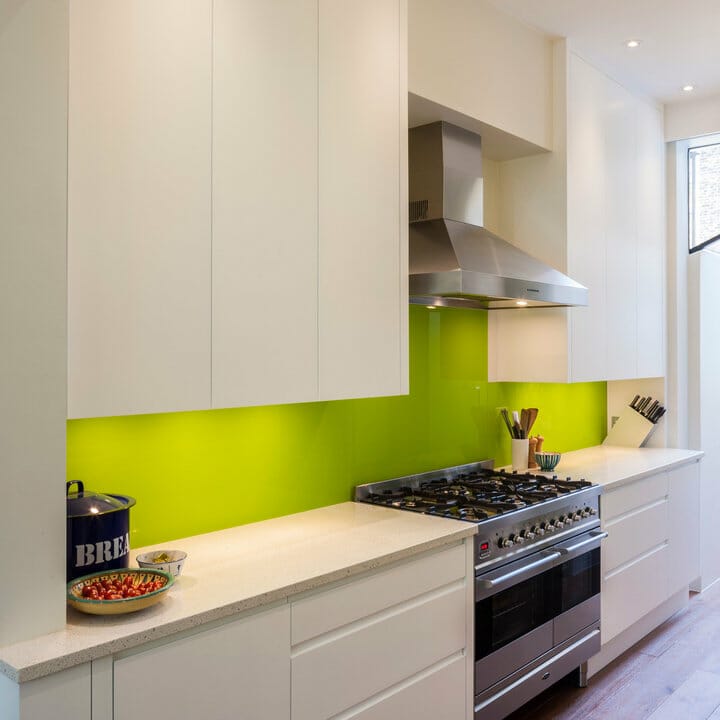 As the photo shows, the chartreuse green backsplash clashes with the granite counter. Meanwhile, the crisp white cabinets have no handles. They generate a streamlined look.