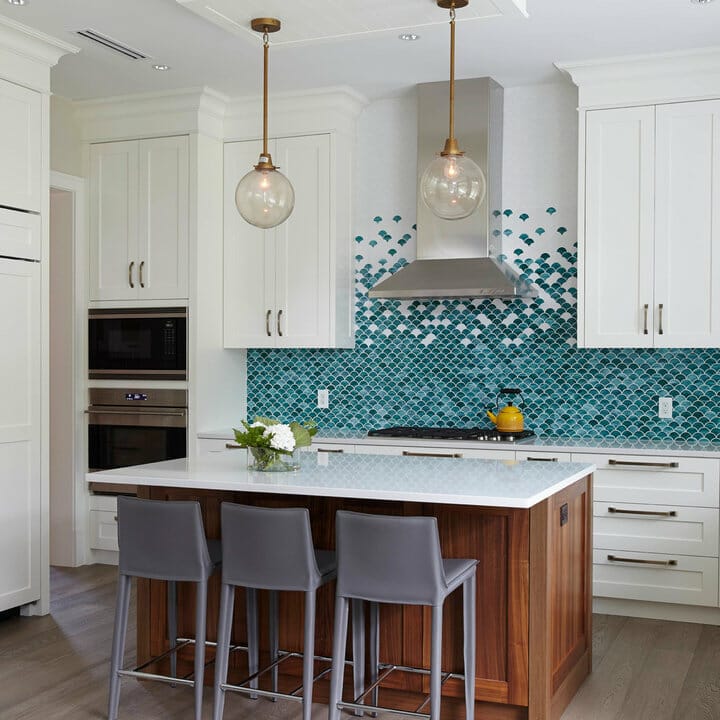 Need white cabinet kitchen backsplash ideas? Try this option out. The teal fish scale tiles are mesmerizing. Moreover, the pieces infuse a bit of texture.