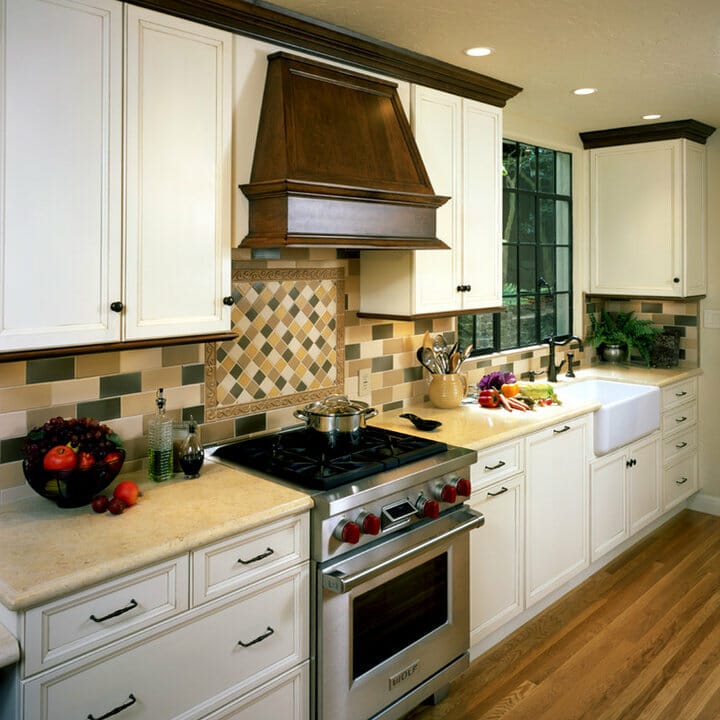 As you see, the aesthetically pleasing backsplash tiles emanate Mediterranean vibes. Furthermore, they give the whole cooking area textural interest. The items call attention to the ornate range hood and cabinet doors.