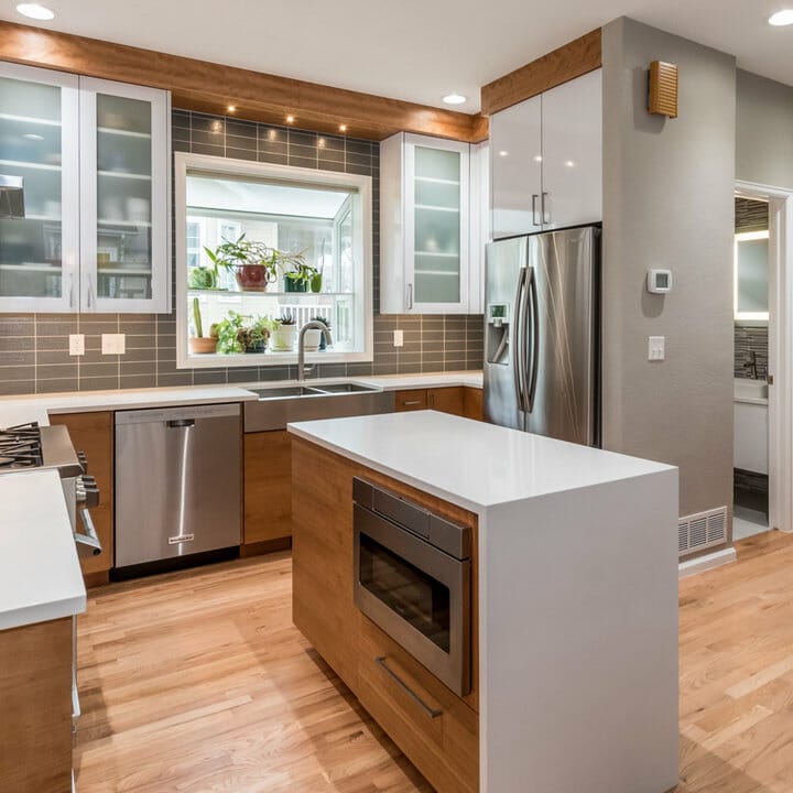 The herringbone tile layout of the backsplash inset offers a mesmerizing finished look. To keep things homey, the homeowner installed light-toned wooden flooring.