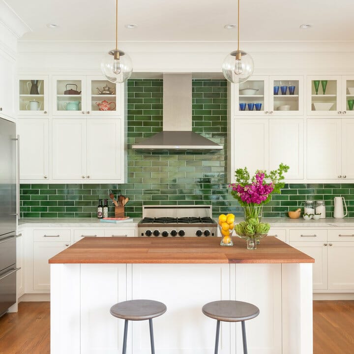 Here, emerald green subway tiles make for a bodacious backsplash. They’re a dramatic contrast to pure white kitchen cabinets with silver hardware pieces.