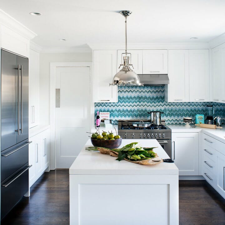 The glass tiles come in varying blue shades for a striking look. Due to them, the bright white kitchen doesn’t appear dull.