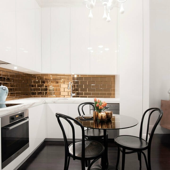 Mirrored copper tiles steal the spotlight, thanks to white cabinets. Additionally, they bounce the light while keeping the cooking area warm.
