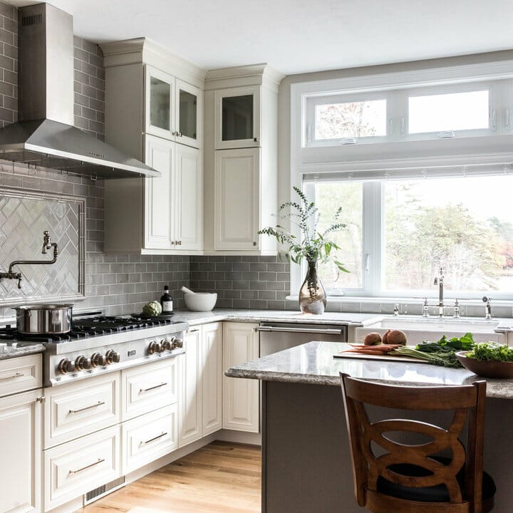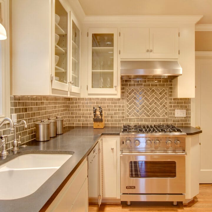 These warm gray subway tiles boast white grout lines for a subtle contrast. Meanwhile, the herringbone tile pattern ensures that the backsplash inset looks gorgeous.