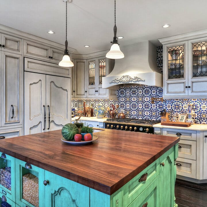 Not only is this cooking area dreamy but also cheerful. Moreover, stunning Spanish tiles cover the backsplash over the natural stone counter.