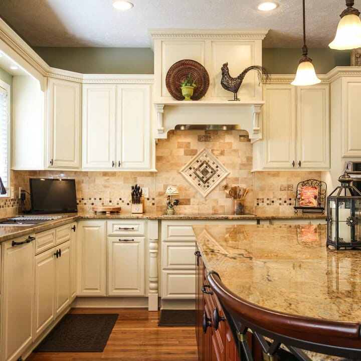 The warm-toned marble subway tiles keep things inviting. Furthermore, they match with soft white cabinets in this French country kitchen.