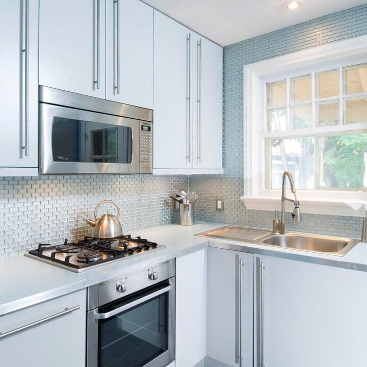 This is probably the best backsplash for white kitchen cabinets. The stainless steel backsplash transforms the cooking space into a chef’s paradise.