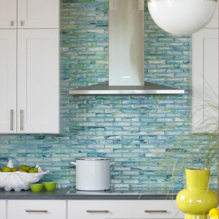 The backsplash of this kitchen employs slim subway tiles. Furthermore, they wear light green, turquoise, and sky blue for a coastal atmosphere.