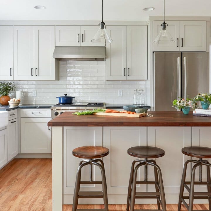 I admire this modern farmhouse kitchen backsplash with white cabinets. Here, the subway tiles accompany the white-painted cabinetry perfectly.