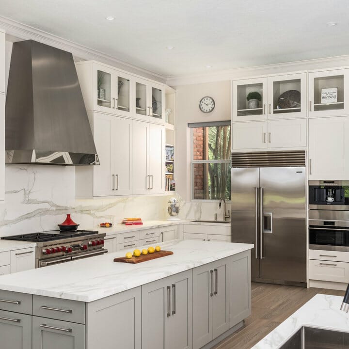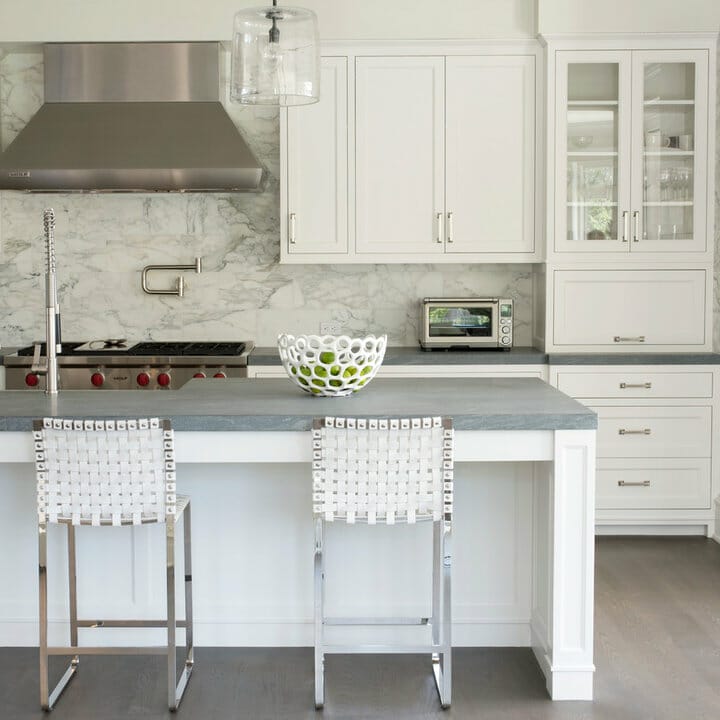 Undoubtedly, soft white and warm gray make for a fantastic pairing. Also, those neutrals allow the homeowner to create an open and serene cooking space.