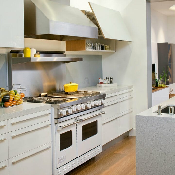 Since the stainless steel backsplash is wipeable, it surely makes cooking cleanup easier. It infuses a touch of metallic silver while giving the interior a luxurious feel. Lastly, the kitchen appliances complement it fabulously.