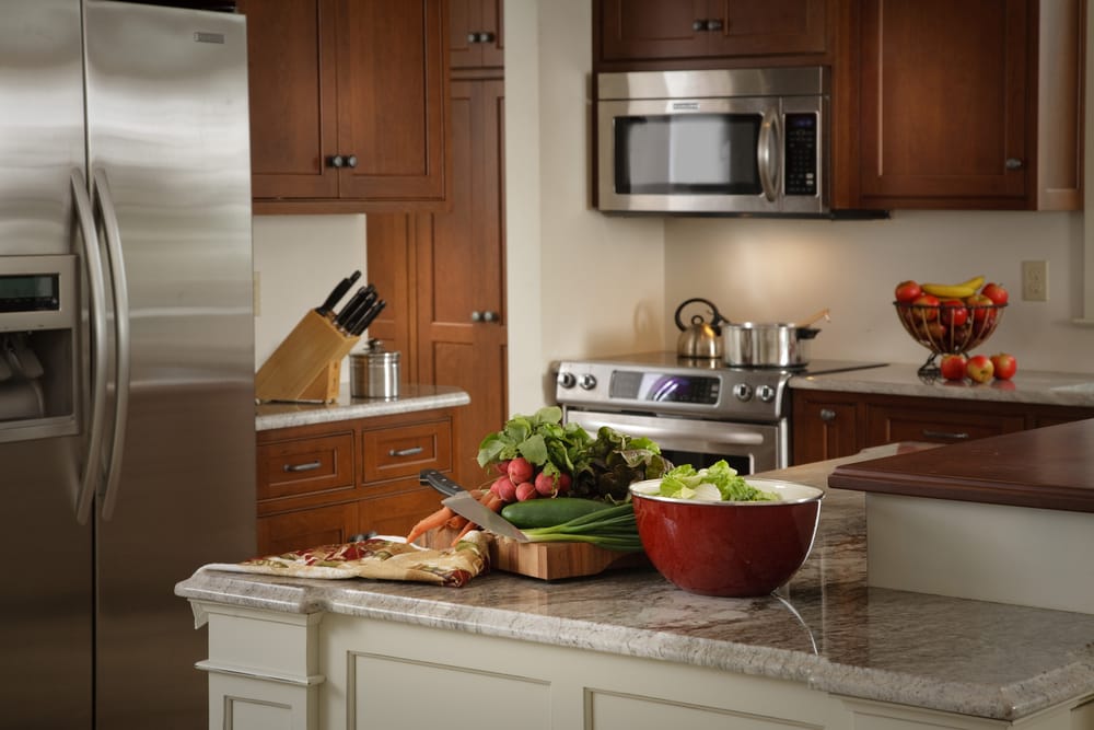 Metallic household appliances reflect light into the room. Meanwhile, wood cabinets deliver character and warmth.
