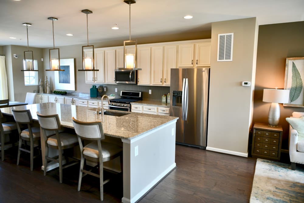 Upholstered chairs round out light gray island with granite countertop. Minimalist pendant lights illuminate the informal dining area.