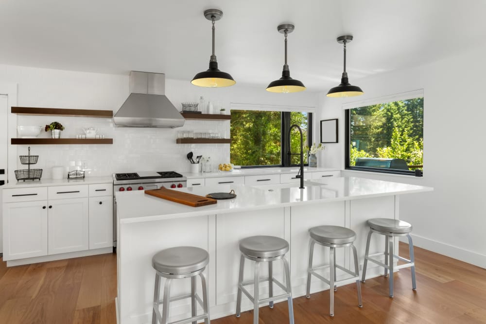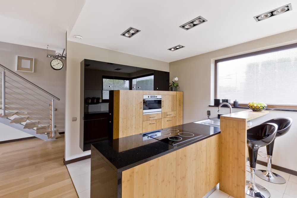 Gray wood floor and island with granite top set the trendy interior design. The under-countertop seating sparks up a superb conversation.