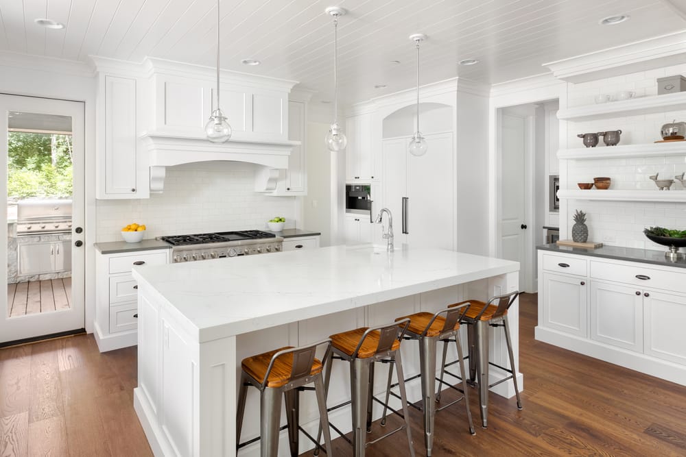 Classic marble top exhibits an air of luxury and splendor. Bulb pendant lights brighten the island after the sun goes down.